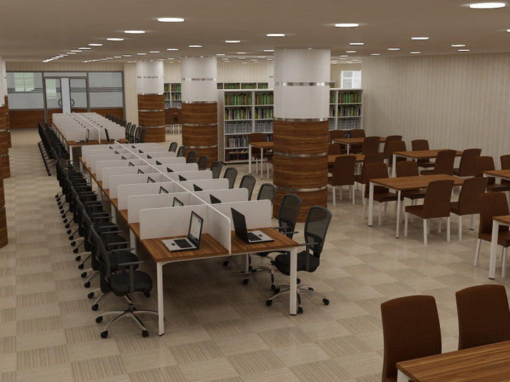 Library furniture, desks, shelves, and other movable elements have been crafted with durable and aesthetically pleasing materials, designed to contribute to the functional and comfortable use of university spaces.