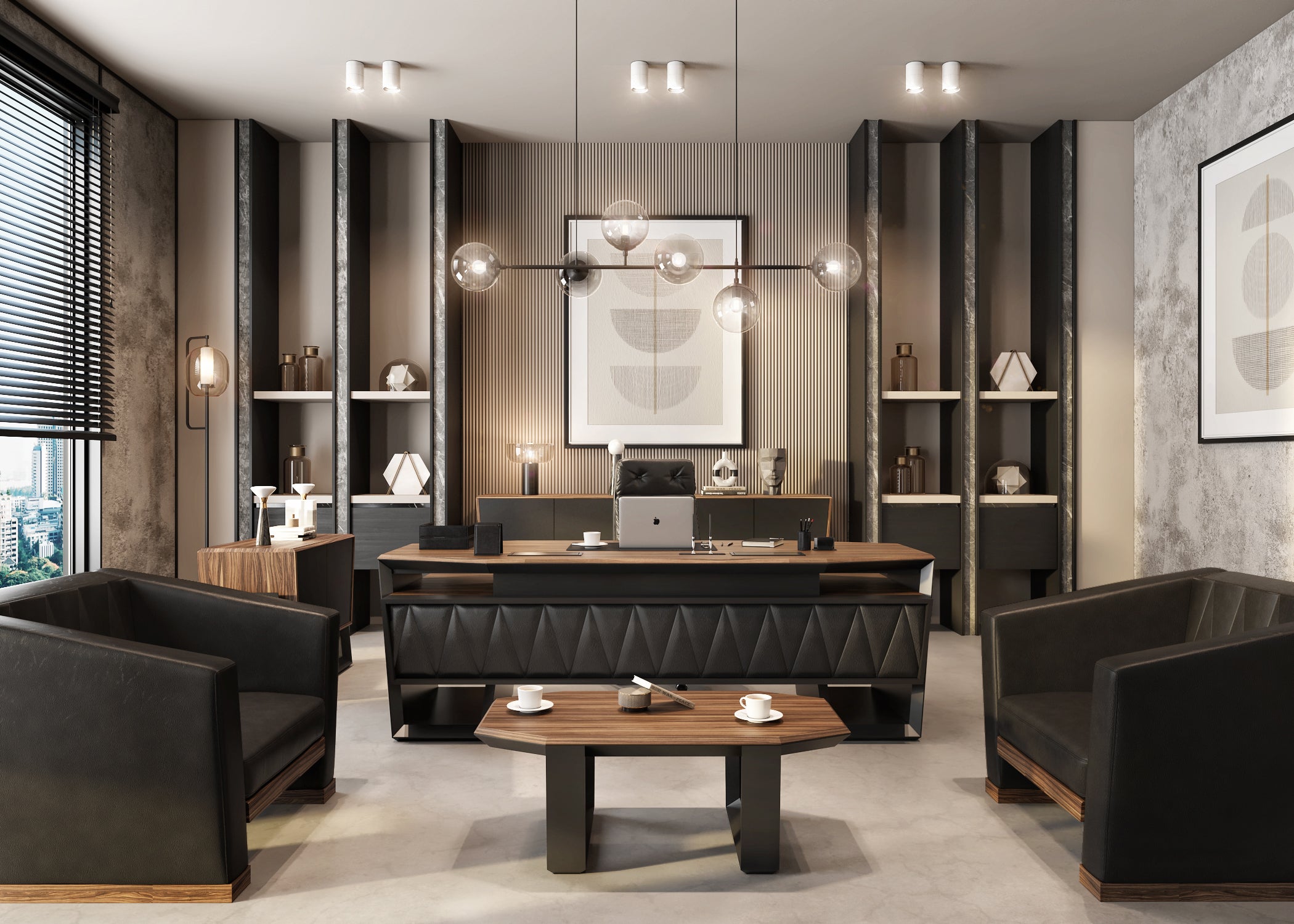 Üst segment ofis mobilyası anlayışıyla tasarlanmış, modern ve prestijli yönetim alanları için geliştirilmiş özel bir koleksiyondur. Lake boyalı özel açılı tasarım masa ve sehpa ayakları, güçlü mimari duruşuyla yönetici ofisine dinamik ve kurumsal bir karakter kazandırır.